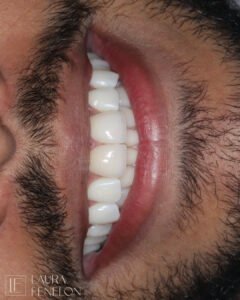 Duas facetas de porcelana associadas ao clareamento dental para alinhar cor, proporção e estética com sutileza e preservação máxima da estrutura dental.